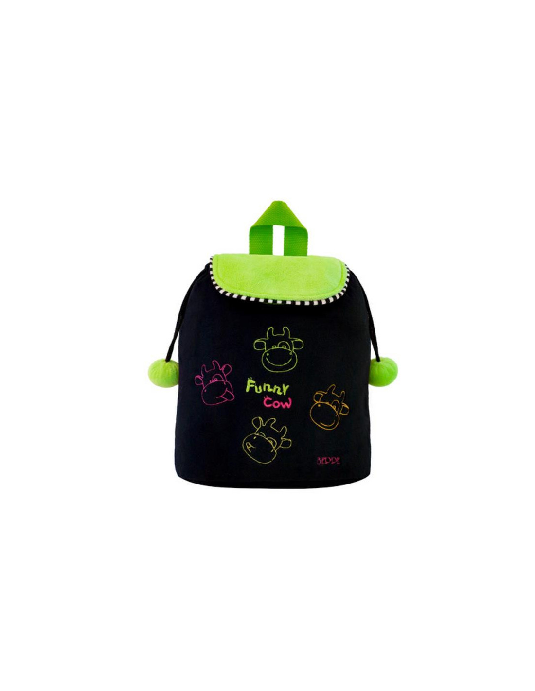 Pluszowy plecak z kolekcji Krówka Funny. Plecak w kolorze czarnym z zielonymi elementami. Wysoka jakość wykonania.
