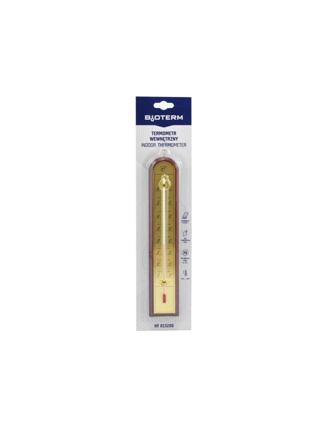 Termometr drewniany z jednej strony zakończony łukiem. Kapilara naklejona centralnie na złotej, wyraźnej i czytelnej skali.