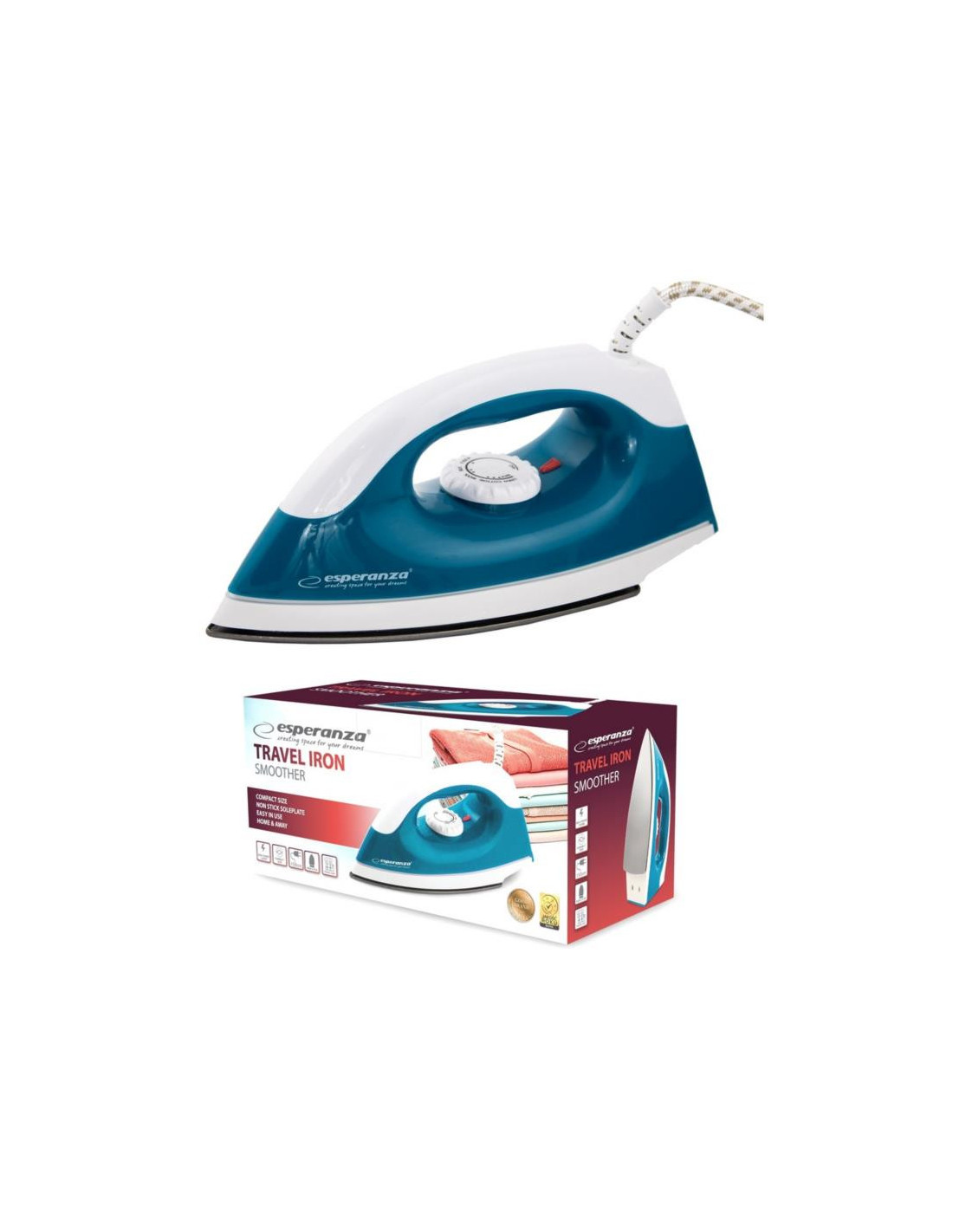 Turystyczne żelazko Esperanza SMOOTHER doskonale sprawdzi się przede wszystkim na wyjeździe, ale nic nie stoi na przeszkkodzie, by na stałe używac go w domu. Żelazko jest małe, lekkie i poręczne, a przede wszystkim bardzo łatwe w obsłudze