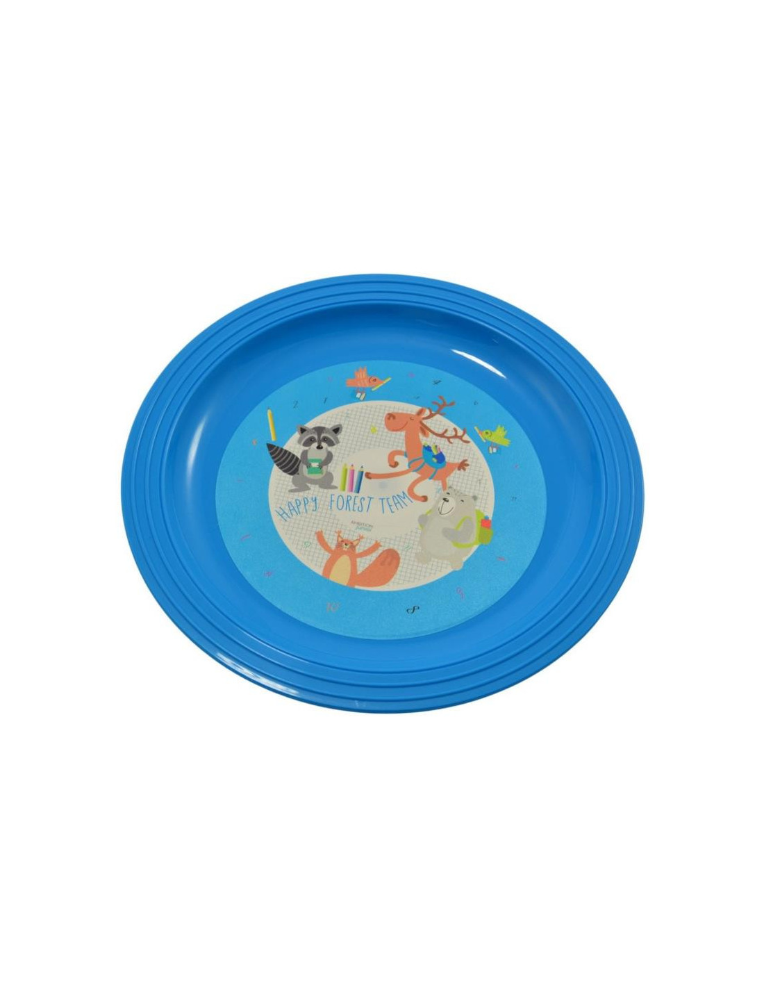 Wykonany z tworzywa sztucznego, dzięki temu jest lekki i odporny na uszkodzenia. Niebieski kolor oraz wizerunek przyjaciół leśnych: wiewiórki, szopa, renifera i niedźwiadka, sprawiają, że jest przyjemny dla oka i zachęca dzieci do jedzenia. Może być używany w kuchni lub na zewnątrz podczas rodzinnych pikników lub grilla.
