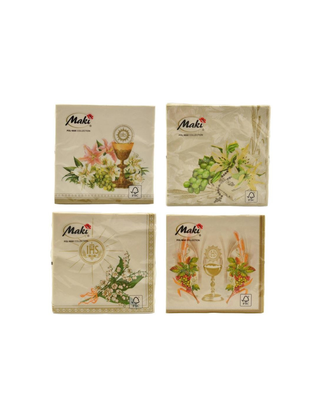 Serwetki trójwarstwowe w kolorze białym z komunijnym nadrukiem.
