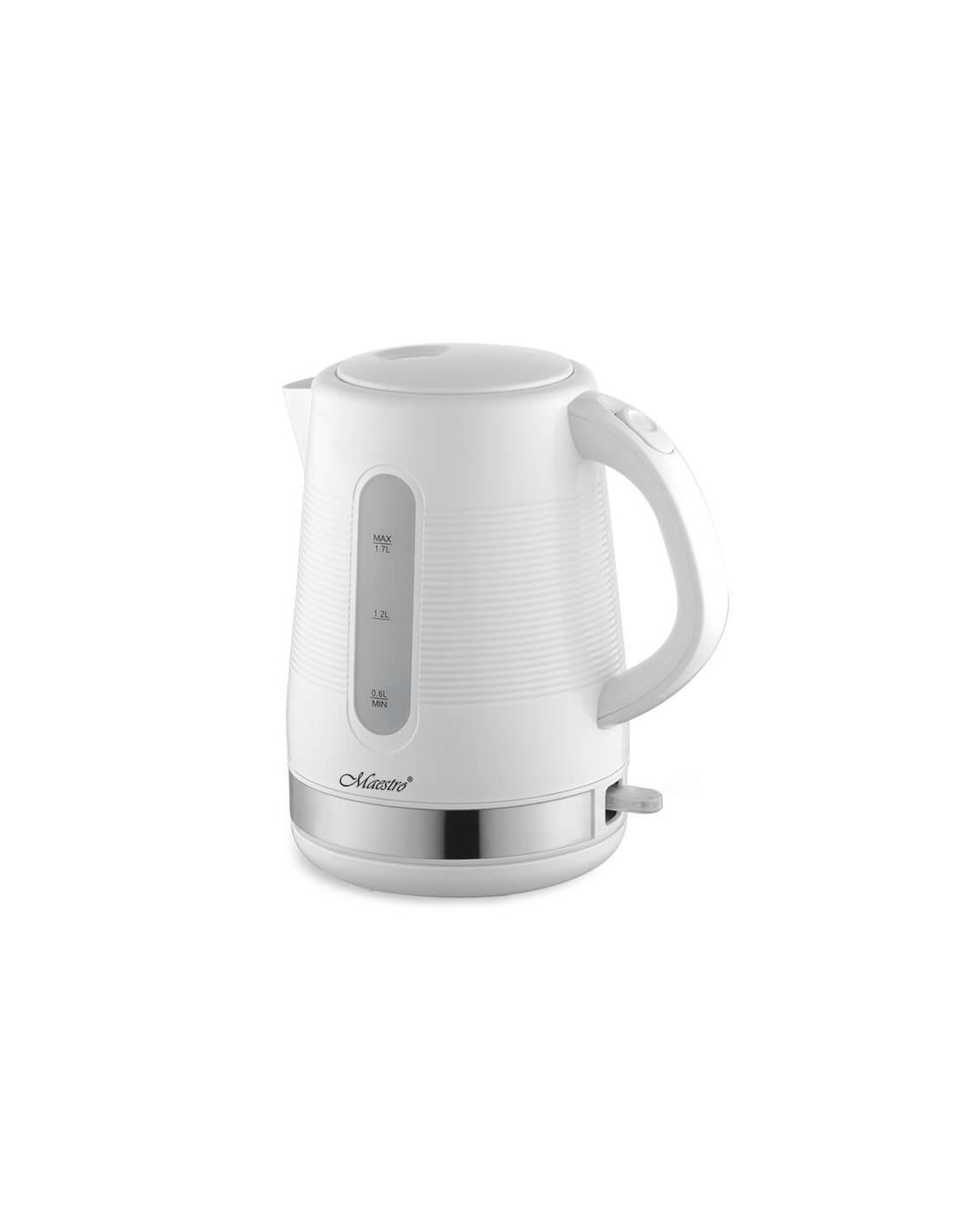 Czajnik Maestro został wykonany z wysokiej jakości tworzywa sztucznego, co gwarantuje trwałość i łatwość czyszczenia. Wyposażony w filtr antywapienny, zapewnia czystą i smaczną wodę bez niechcianych zanieczyszczeń. Dodatkowo, czajnik posiada wskaźnik poziomu wody, który ułatwia kontrolę ilości wody wewnątrz.