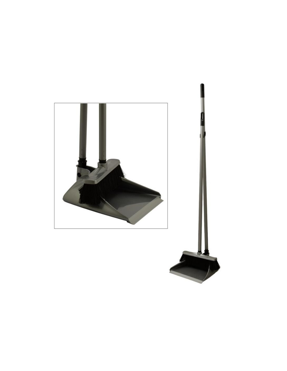 BENTOM - zestaw do sprzątania składający się z szarej zmiotki na kiju oraz szufelki, również na kiju w tym samym kolorze, z czarnymi elementami.