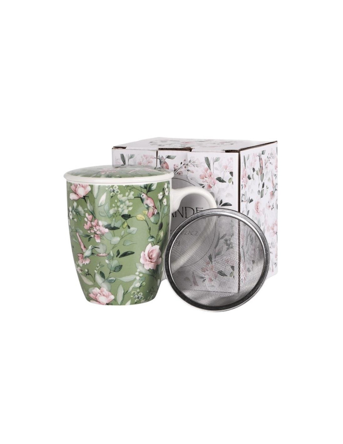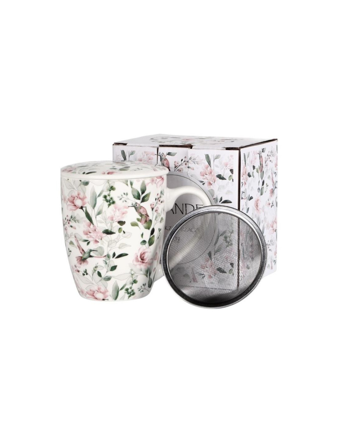 Kubek zaparzacz z metalowym sitkiem i porcelanową pokrywką. Zdobiony rowerami w romantycznym stylu.