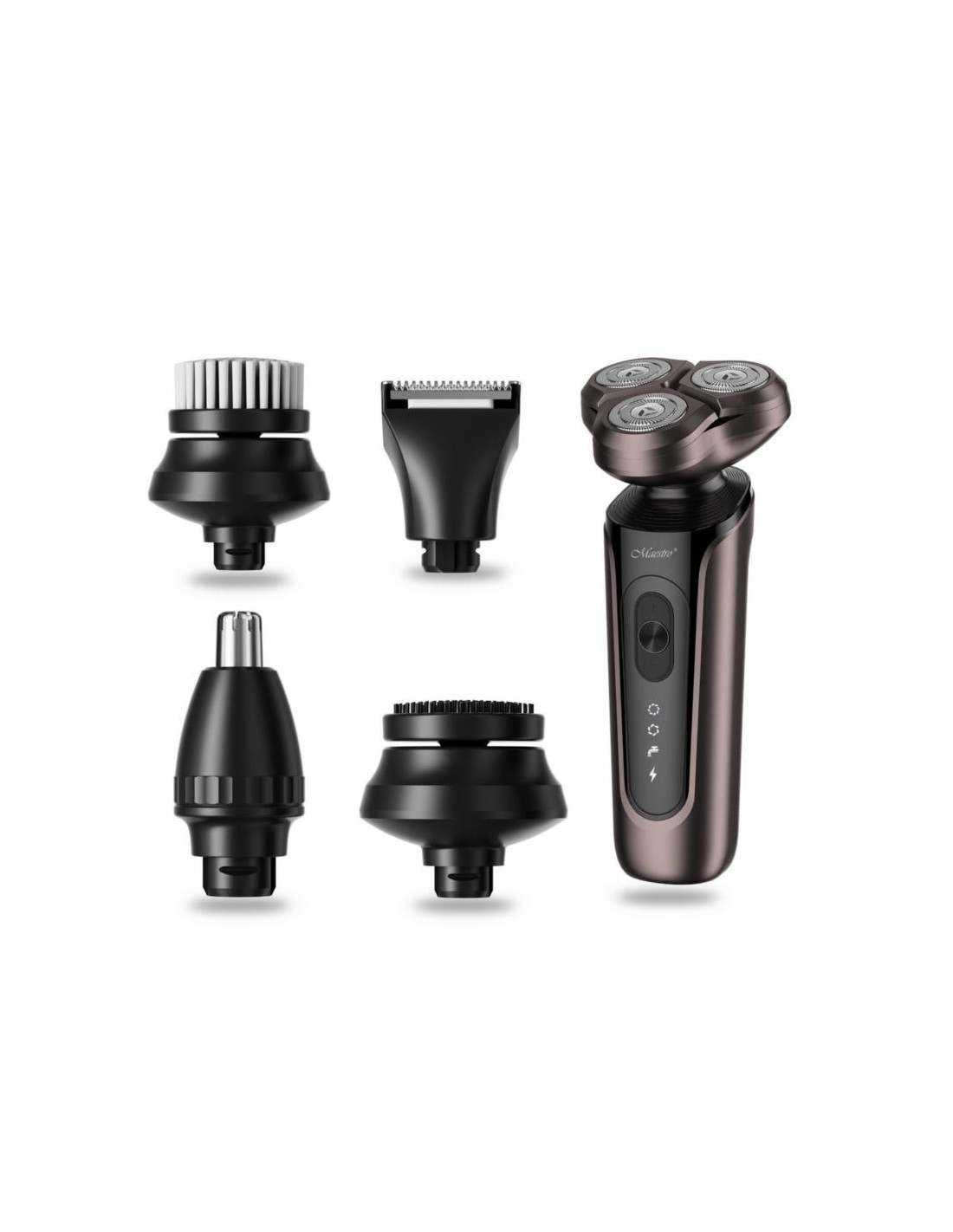 Zestaw do golenia 5w1 USB-C Maestro MR-674 to kompleksowe rozwiązanie dla mężczyzn, które łączy w sobie nowoczesną technologię i funkcjonalność. Urządzenie zasilane litową baterią o pojemności 600 mAh oferuje szeroki wachlarz funkcji, w tym golenie, przycinanie nosa, oraz oczyszczanie twarzy dzięki dołączonej szczoteczce. Dodatkowo, zestaw wyposażony jest w końcówkę do masażu oraz trymer do włosów z trzema wymiennymi nasadkami (3 mm, 5 mm, 7 mm), co umożliwia precyzyjne dopasowanie do indywidualnych potrzeb.