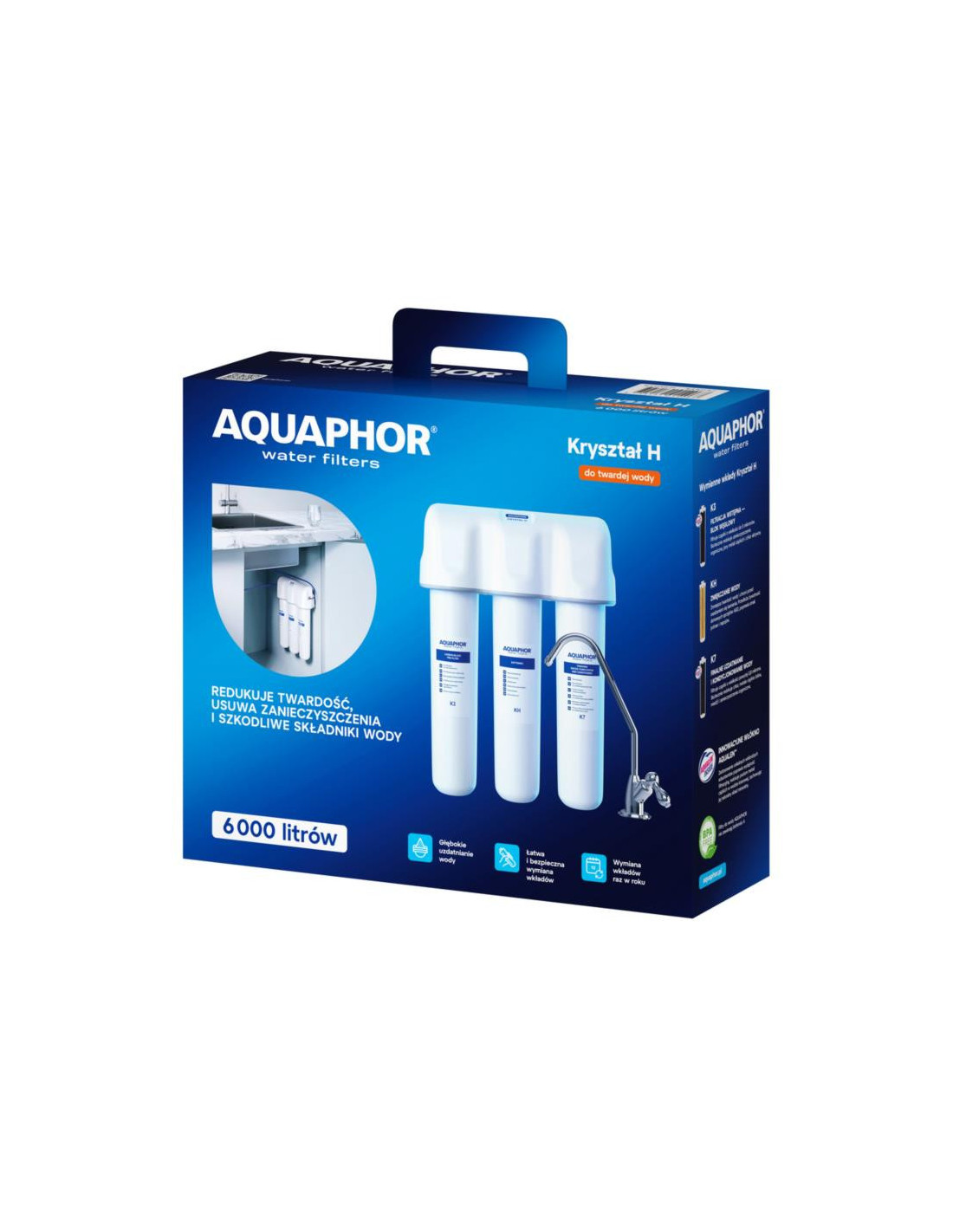 AQUAPHOR Kryształ H to kuchenny filtr podzlewowy przeznaczony do uzdatniania oraz zmiękczania wody pitnej o podwyższonym stopniu twardości, dzięki czemu przygotowane na jej bazie napoje i potrawy są zdrowsze, smaczniejsze i bardziej aromatyczne. AQUAPHOR Kryształ H usuwa z wody chlor, metale ciężkie, pestycydy, produkty ropopochodne oraz pozostałe toksyny i alergeny, zachowując przy tym odpowiedni skład mineralny wody.