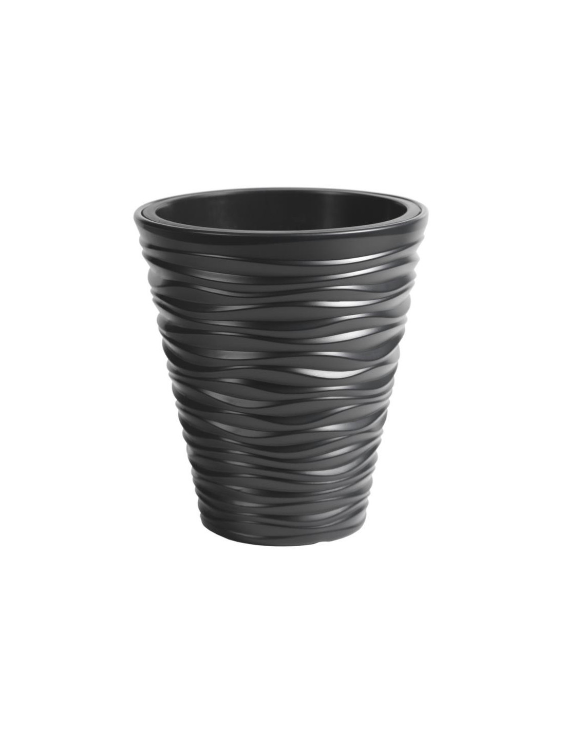 Donica ma klasyczny kształt kielicha, nietradycyjną fakturę przypominającą ozdobioną falami ceramikę oraz stonowaną kolorystykę.