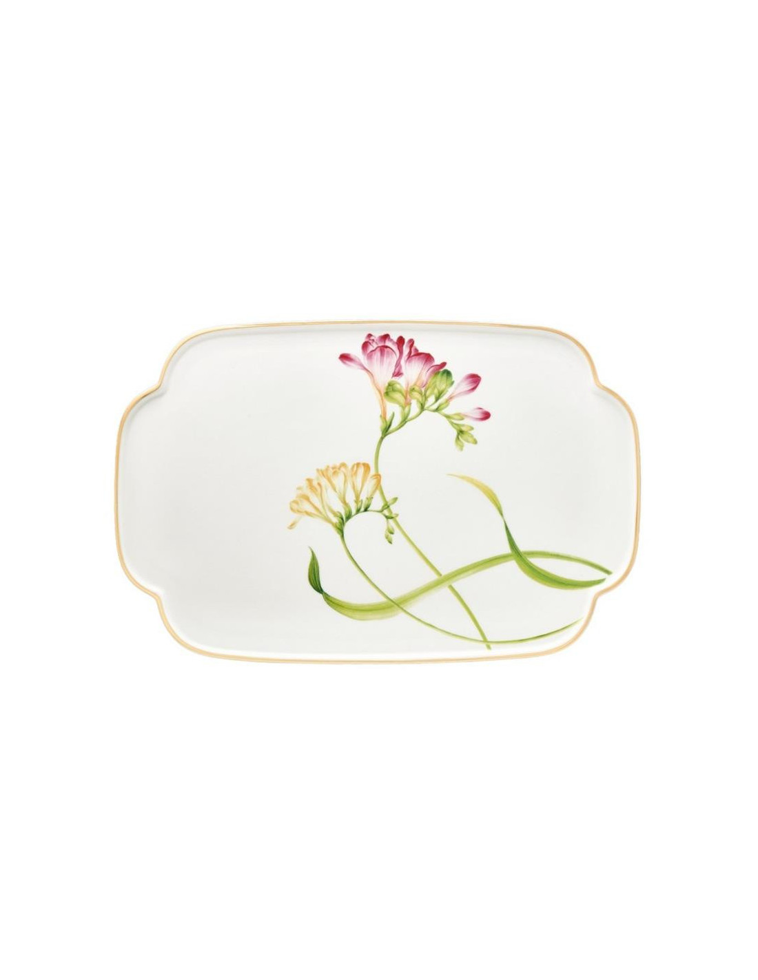 Odkryj niepowtarzalny urok i funkcjonalność porcelanowej patery do ciasta z kolekcji AROMA di FRESIA. Naczynie to jest unikatowe i zachwyca swoim wykończeniem. Talerz wykonany jest z wysokiej jakości porcelany kostnej i dekorowany kolorowym motywem kwiatów frezji. Naczynie jest formowane, szkliwione i dekorowane ręcznie złotem.