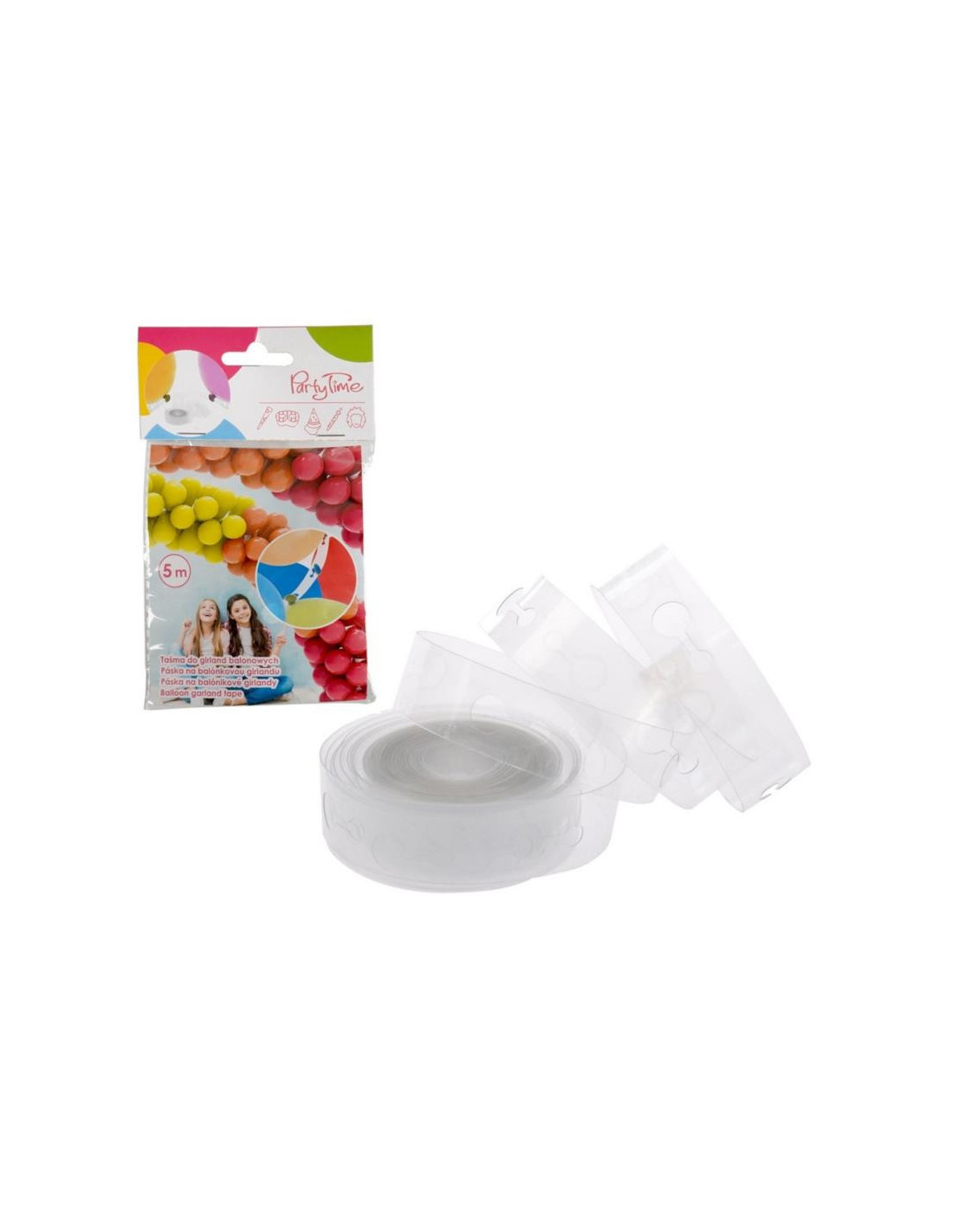 Taśma do tworzenia girland balonowych. Produkt posiada wycięte otwory w równych odstępach umożliwiające mocowanie balonów. Jedna taśma umożliwia wykonanie girlandy o długości 5 metrów.