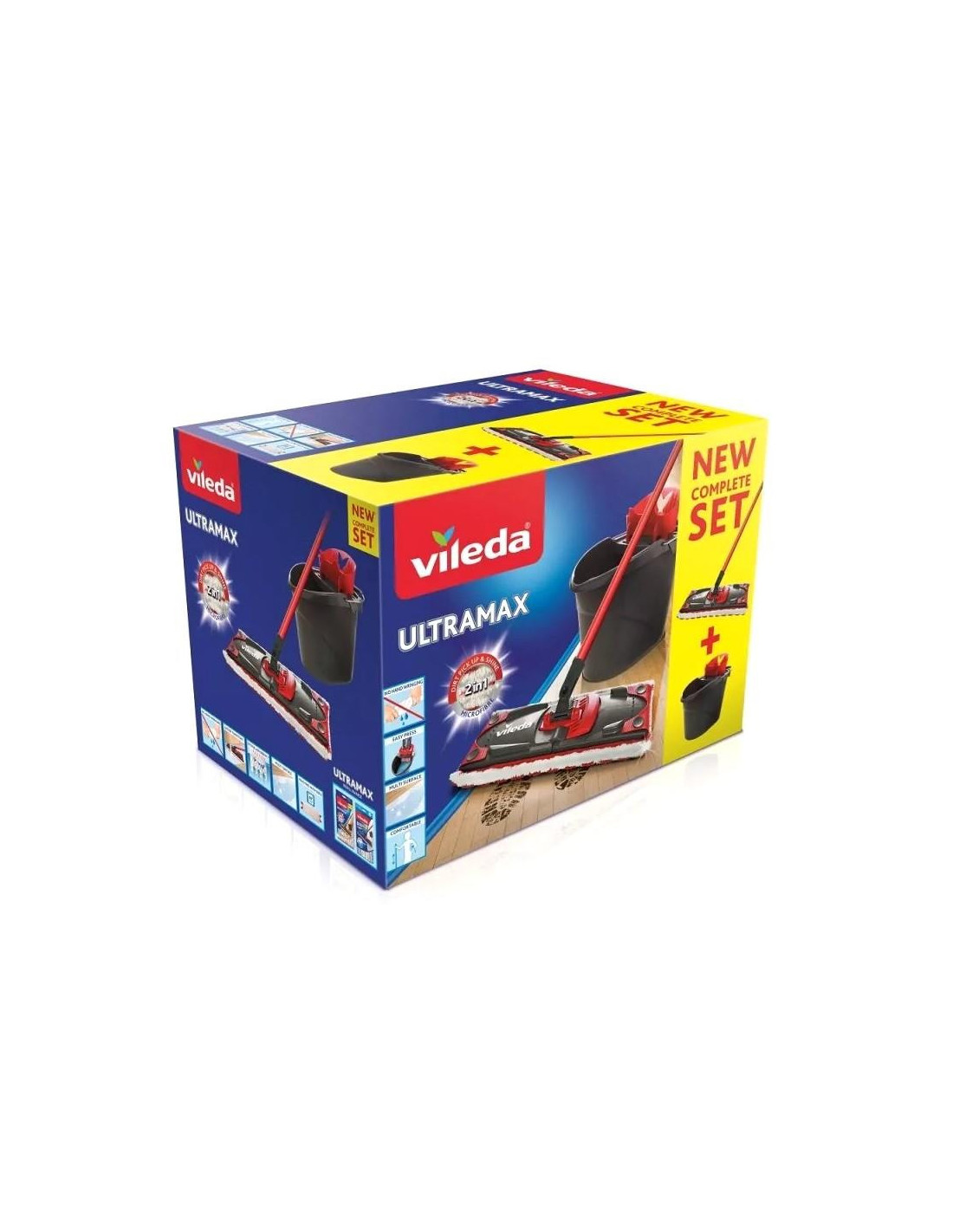 Zestaw Vileda UltraMax BOX zawiera: mop płaski z trzyczęściowym drążkiem, wiadro oraz wyciskacz.