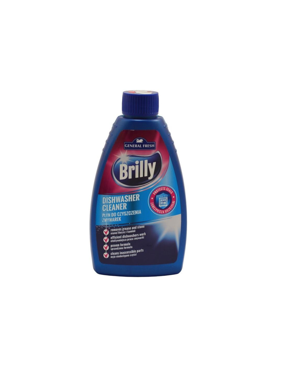 Płyn do czyszczenia zmywarek General Fresh, Brilly. Produkt usuwa tłuszcz i kamień - myje nawet niedostępne części (np. filtry, przewody oraz dysze). Usprawnia dzięki temu działanie zmywarki i przedłuża jej żywotność.